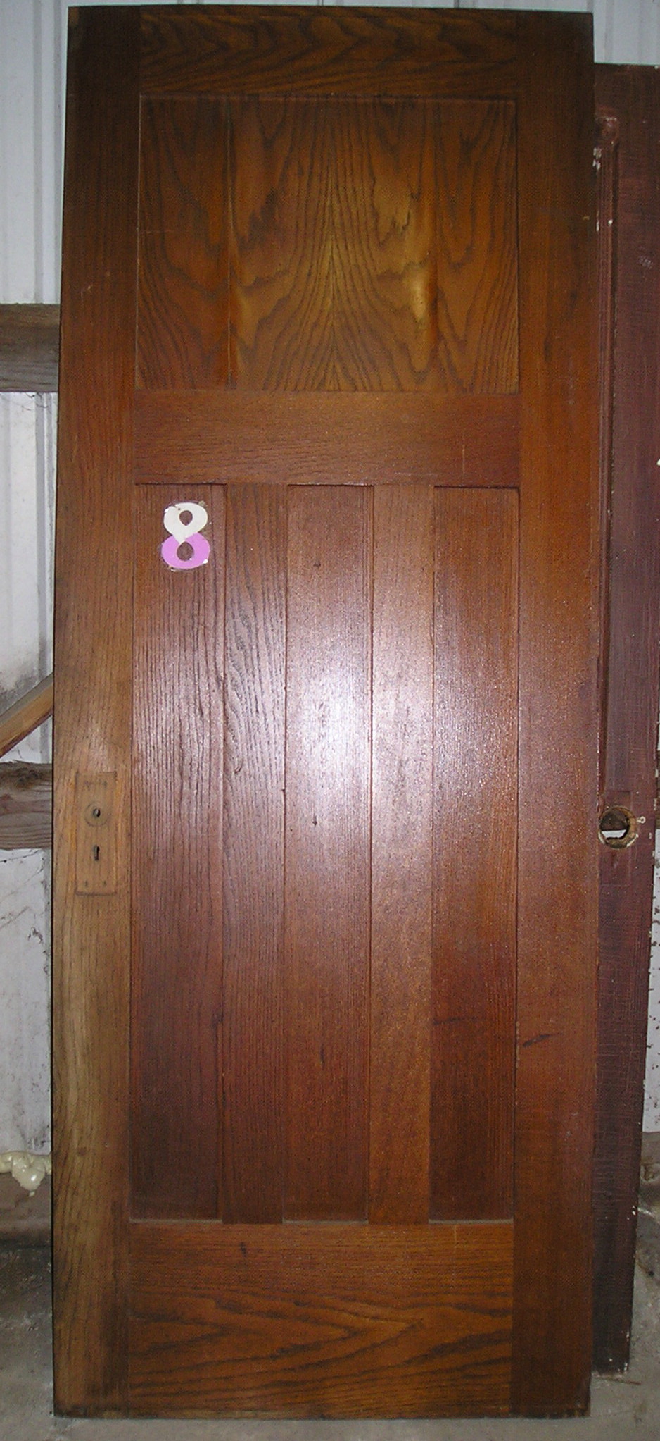 32″ x 84″ classy right-hand oak door. Needs refinishing or restoration – – varnish gone in places.