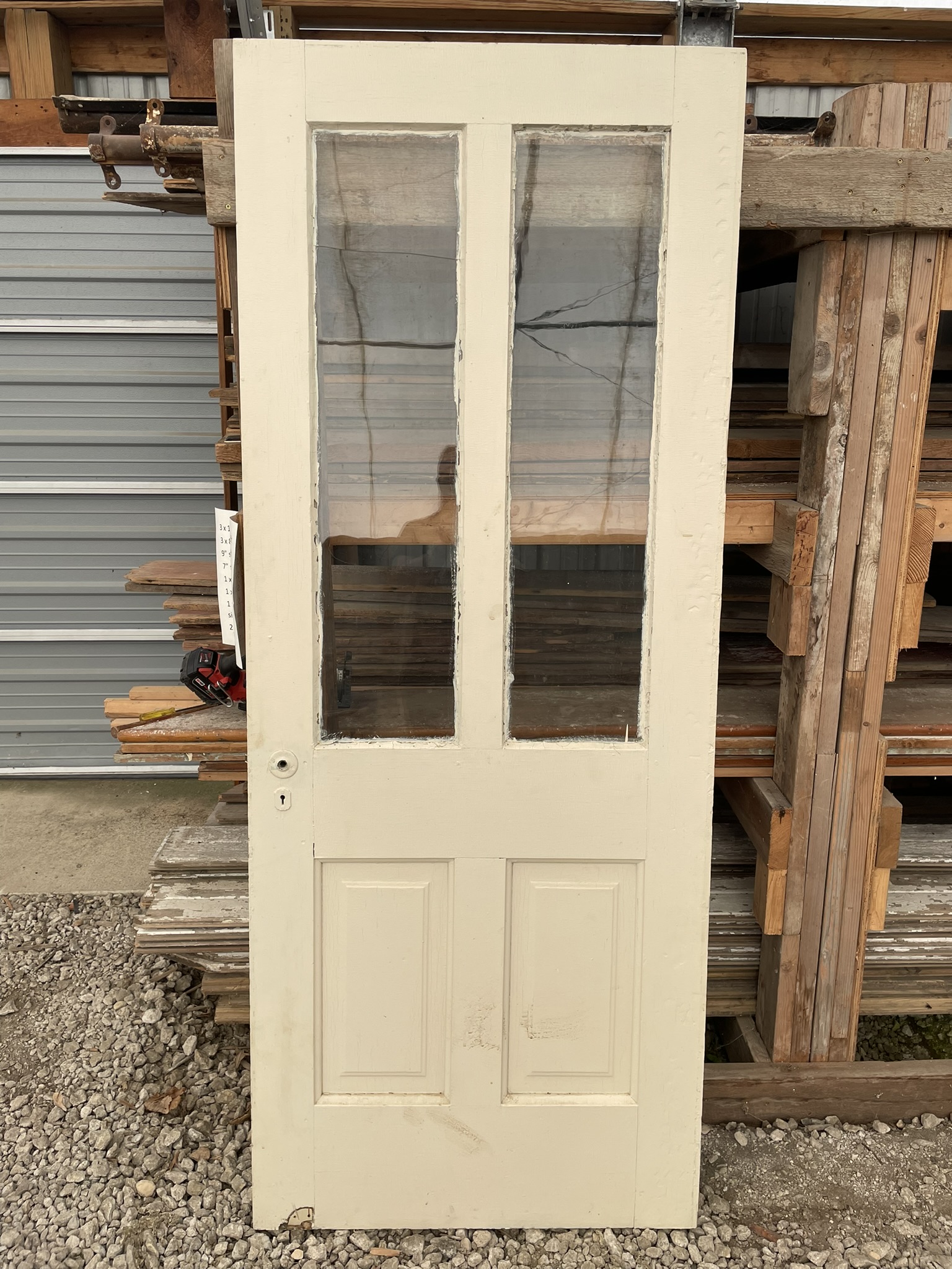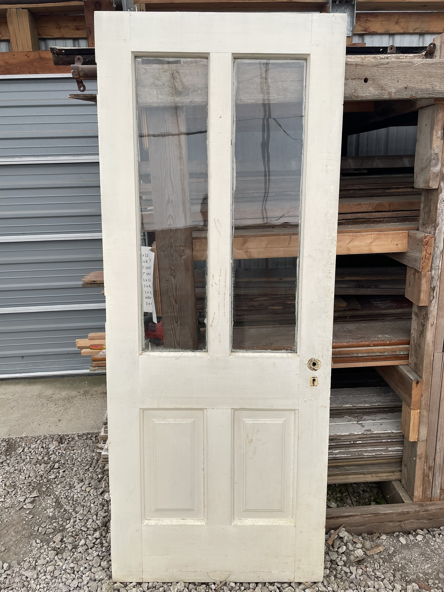 D7419 is 32″ w x 80 1/4″ h x 1 3/4″ d. One glass pane is cracked. $165.